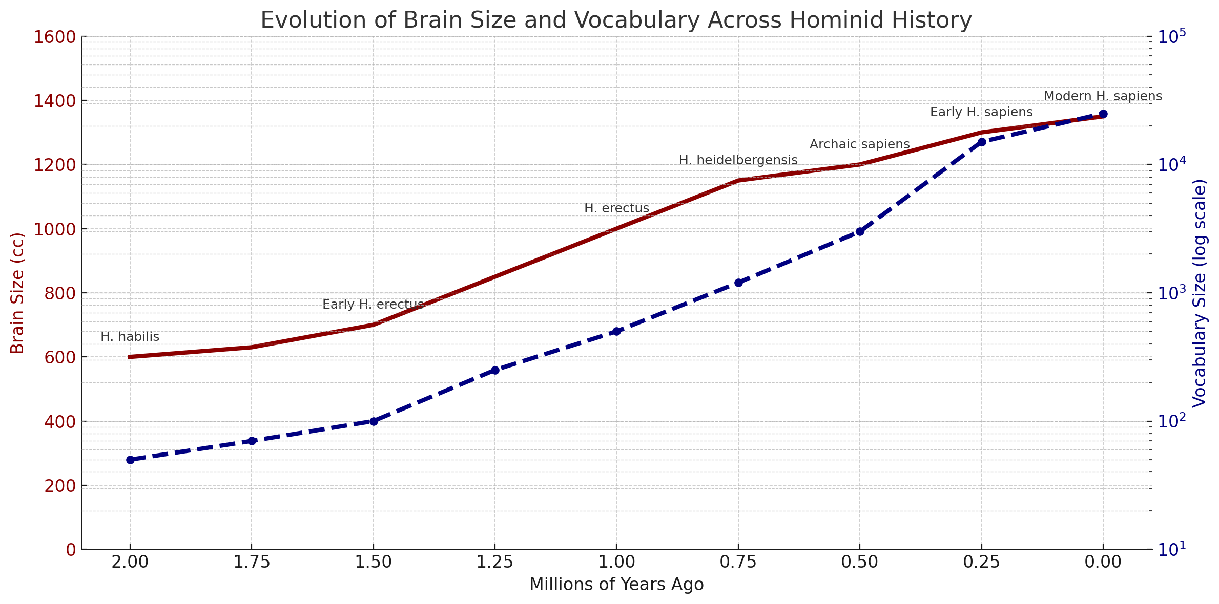 The doubling of our brain size matches a logarithmic growth in our vocabulary, and so it brings us into a chicken-or-the-egg situation. Which guided which?