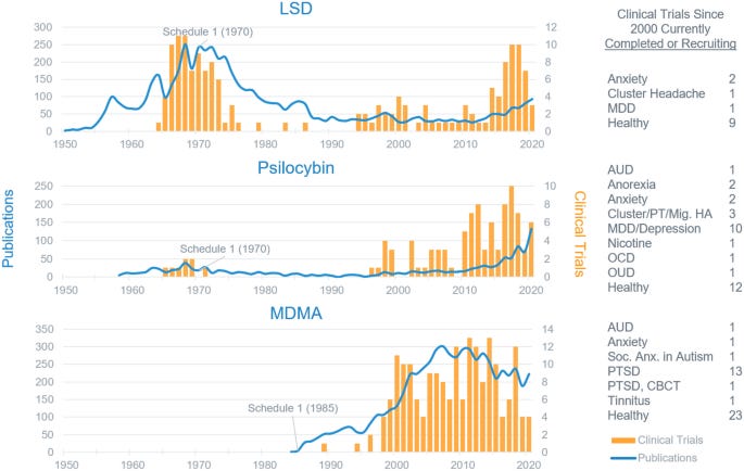 Look at 1992 (the year Food of the Gods was published): publications on psychedelics were at an all-time low (since their rediscovery in the 20th century), and 0 clinical trials were conducted with LSD or psilocybin. It was bleak.