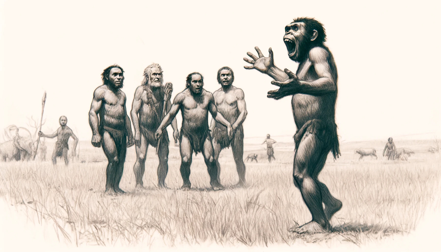 Consider the power new words might have had on a Homo habilis with a vocabulary of less than 50 words. They had the linguistic range of a 2-year old, and used basic utterances and gestures for food, danger, and water. A million years later, Homo erectus, with brains almost double the size, had fire, technology, but also a modern vocal tract, with a vocabulary over 1,000 words, putting them at the fluency of a 3-4 year old. By the time Homo Sapiens were forging words in Egyptian cuneiform, their vocabularies were over 10,000 words.