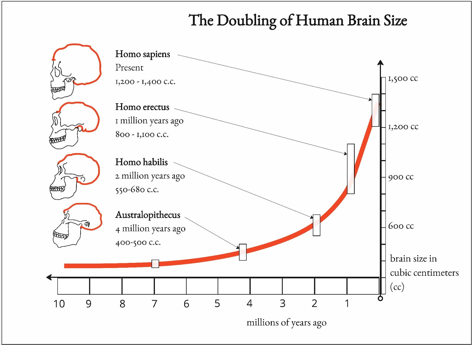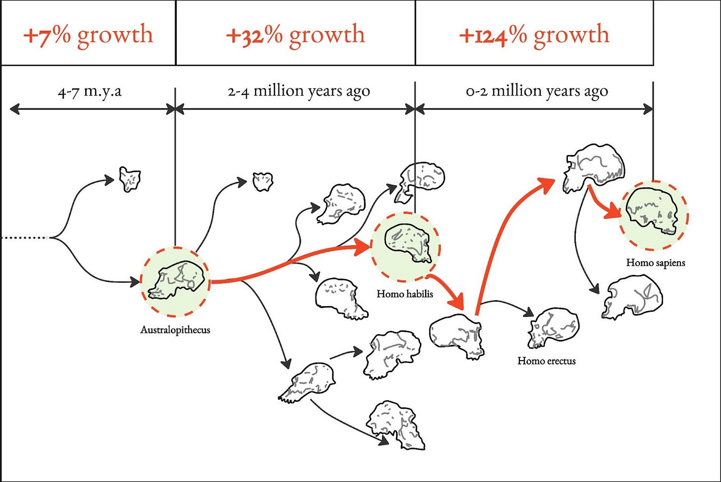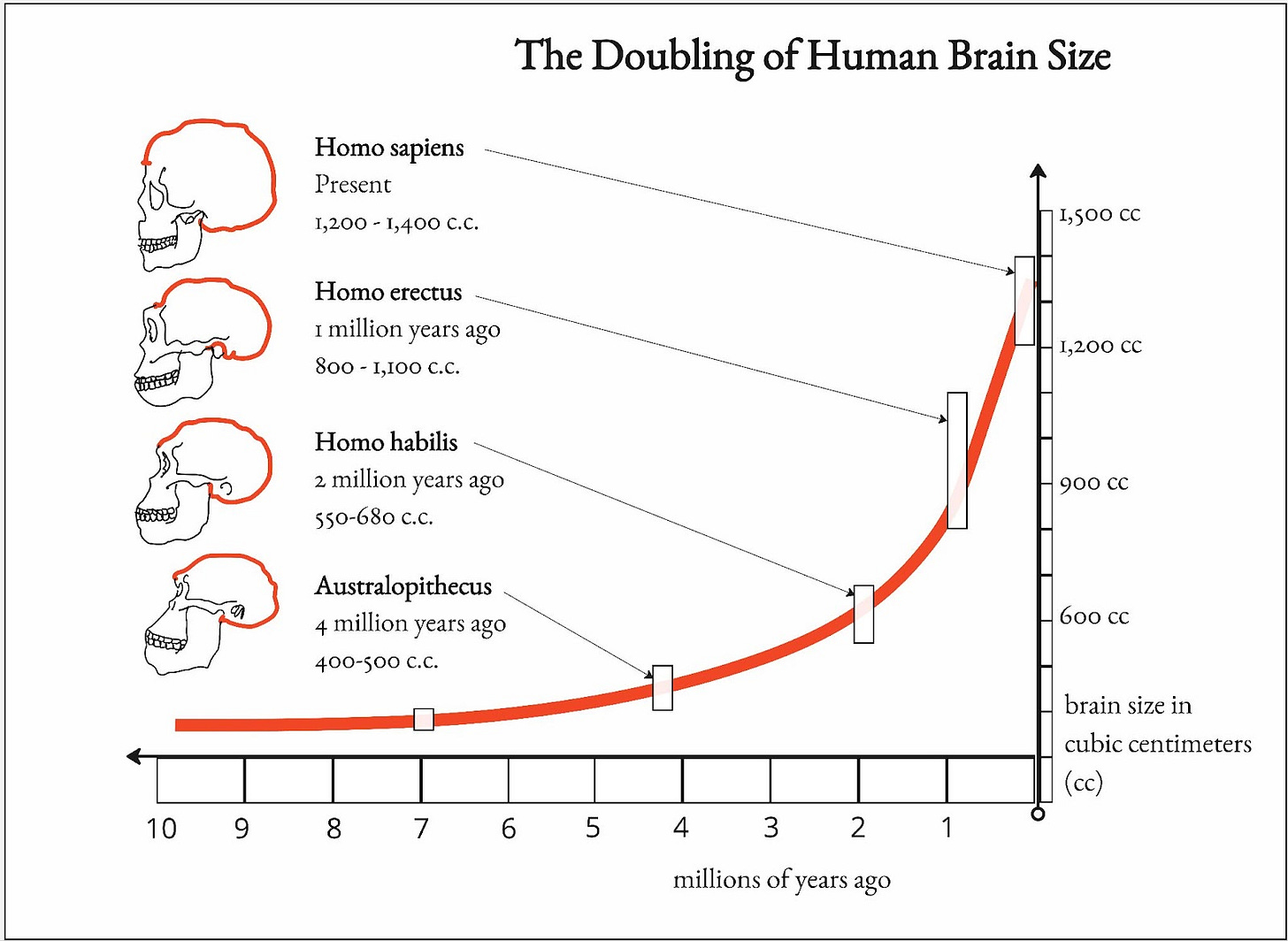 For context, he states that “evolution in high animals … operate[s] in time spans of … tens of millions of years” (p.20). From 4-7 million years ago, the brain only grew around 7%. Then, from 2-4 million years ago, it jumped to 32%. Since Homo habilis emerged, our average brain size has grown 124%. Why the “sudden and mysterious expansion?” (p.22)