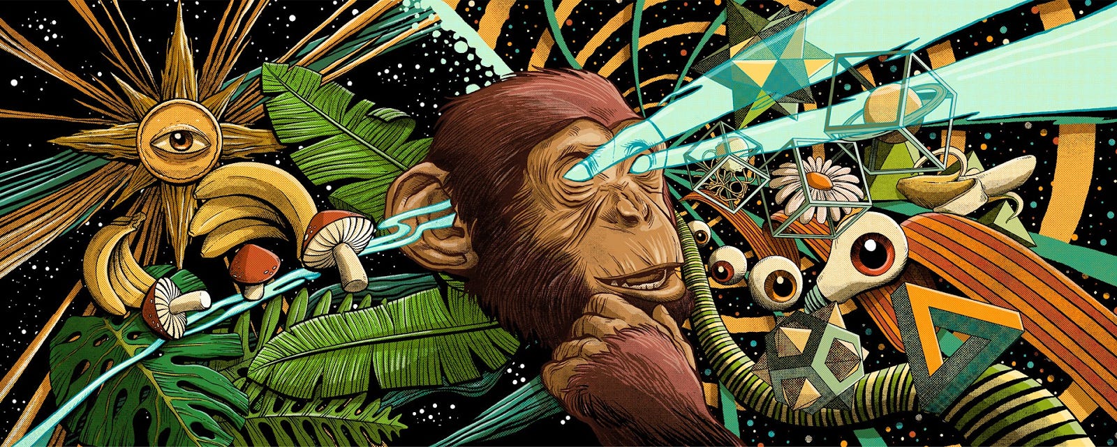The evolutionary mechanism here isn’t the mushroom, it’s language itself. Psychedelics can restructure your brain, but not your kid’s brain, and that’s okay, because the artifacts from a single trip are strong enough to infect everyone around you—even if they’re sober. Think of the words, music, art, culture, and technology that came out of the 1960s from a small subculture of trippers. Through mimesis, language ripples through cultures and generations like a shockwave. It’s time we consider that the word itself might have been the original burst from the mushroom.